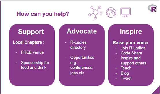 - Become a chapter organizer by volunteering with your local chapter or starting your own (please get in touch via chapters@rladies.org)