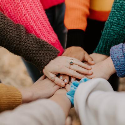 Photo by Hannah Busing on Unsplash. Alt text: Image of arms and hands of women wearing colorful sweaters in a circle with hands piled together.